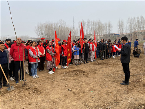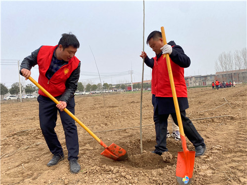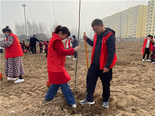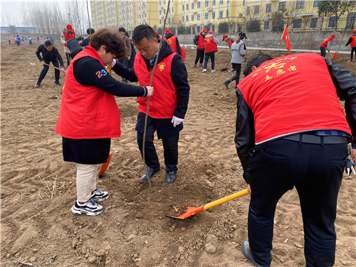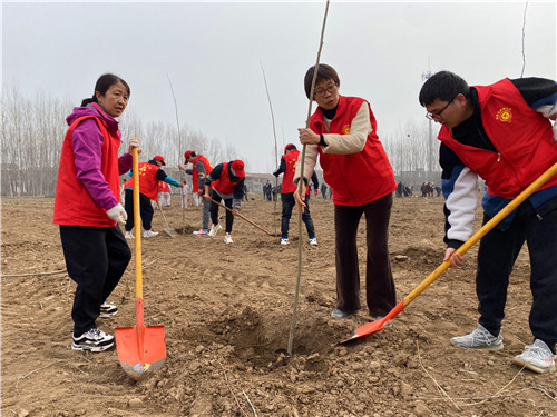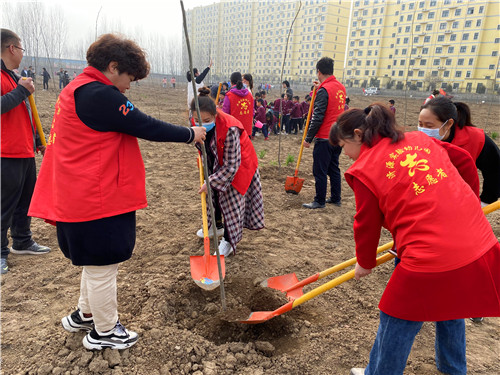 植树地点位于玉泉办事处罡头村,老师们参加完开幕式,了解了植树的意义和具体要求之后,便来到了植树现场的分包区域,开始了热火朝天的植树活动。按照具体的操作流程和方法,有的老师挥锹铲土,有的老师扶好树苗,还有的老师压实松土,旁边还有专业人士进行现场技术指导,能够保证成活率,确保每一棵无絮白杨树苗都能长成参天大树,收获一片片绿色。